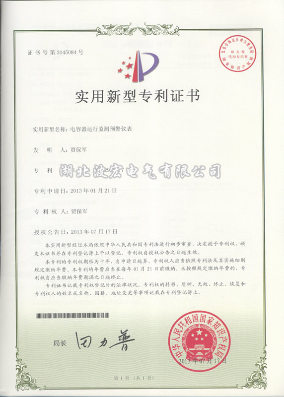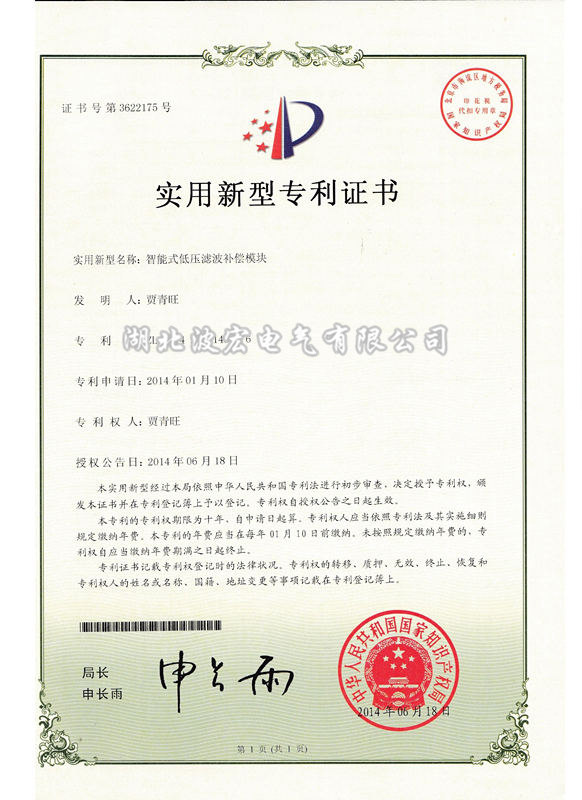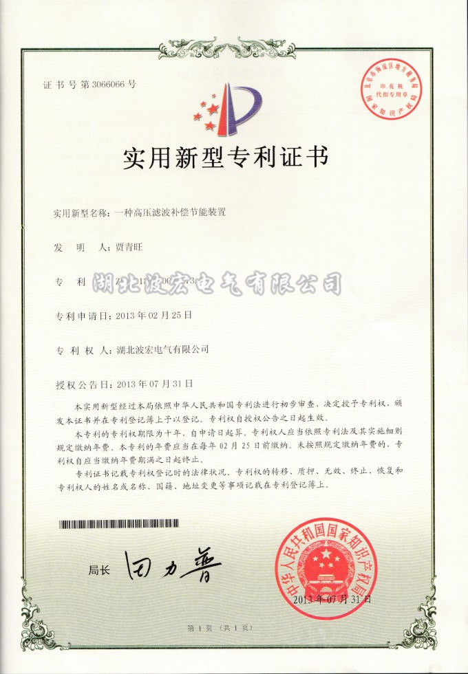 實(shí)用新型專(zhuān)利證書(shū)---高壓濾波節(jié)能裝置