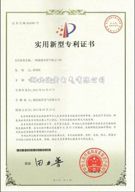 實(shí)用新型專(zhuān)利證書(shū)---高壓濾波節(jié)能裝置